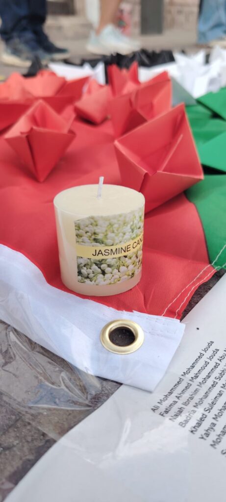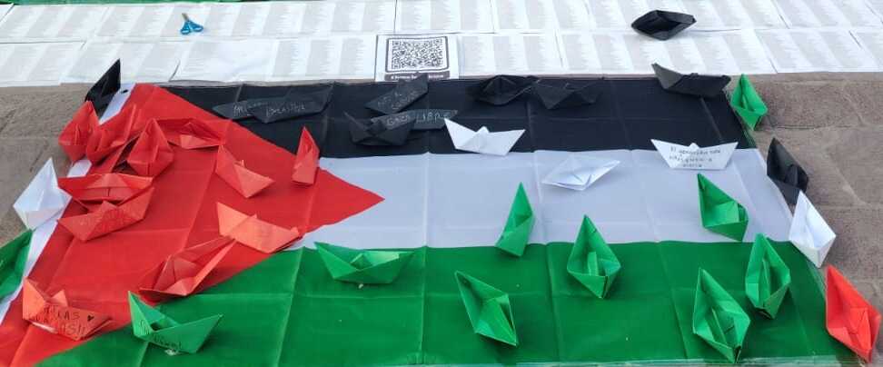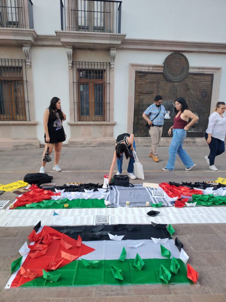 La acción simbólica, registrada en distintas ciudades y replicada también en Aguascalientes, consistió en colocar pequeños barcos de papel como representación de las embarcaciones humanitarias que en múltiples ocasiones han intentado llevar ayuda a la población palestina, bloqueada y asfixiada por el control militar.