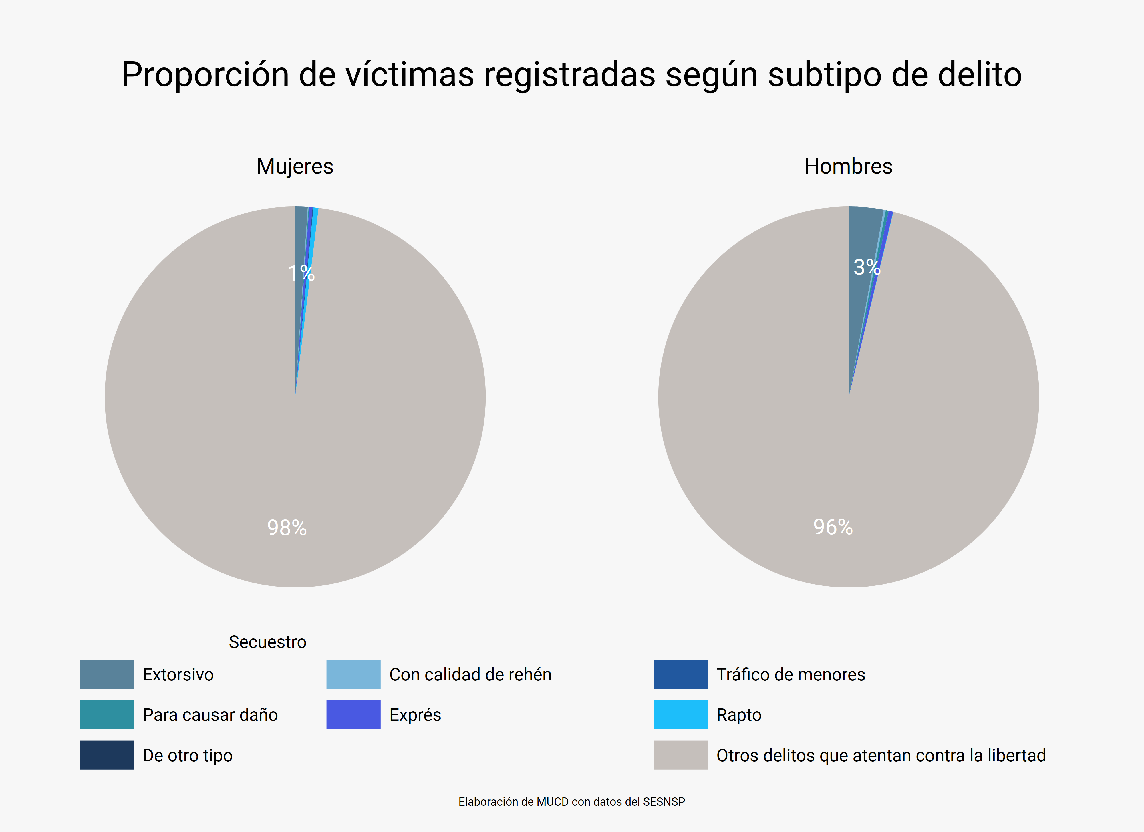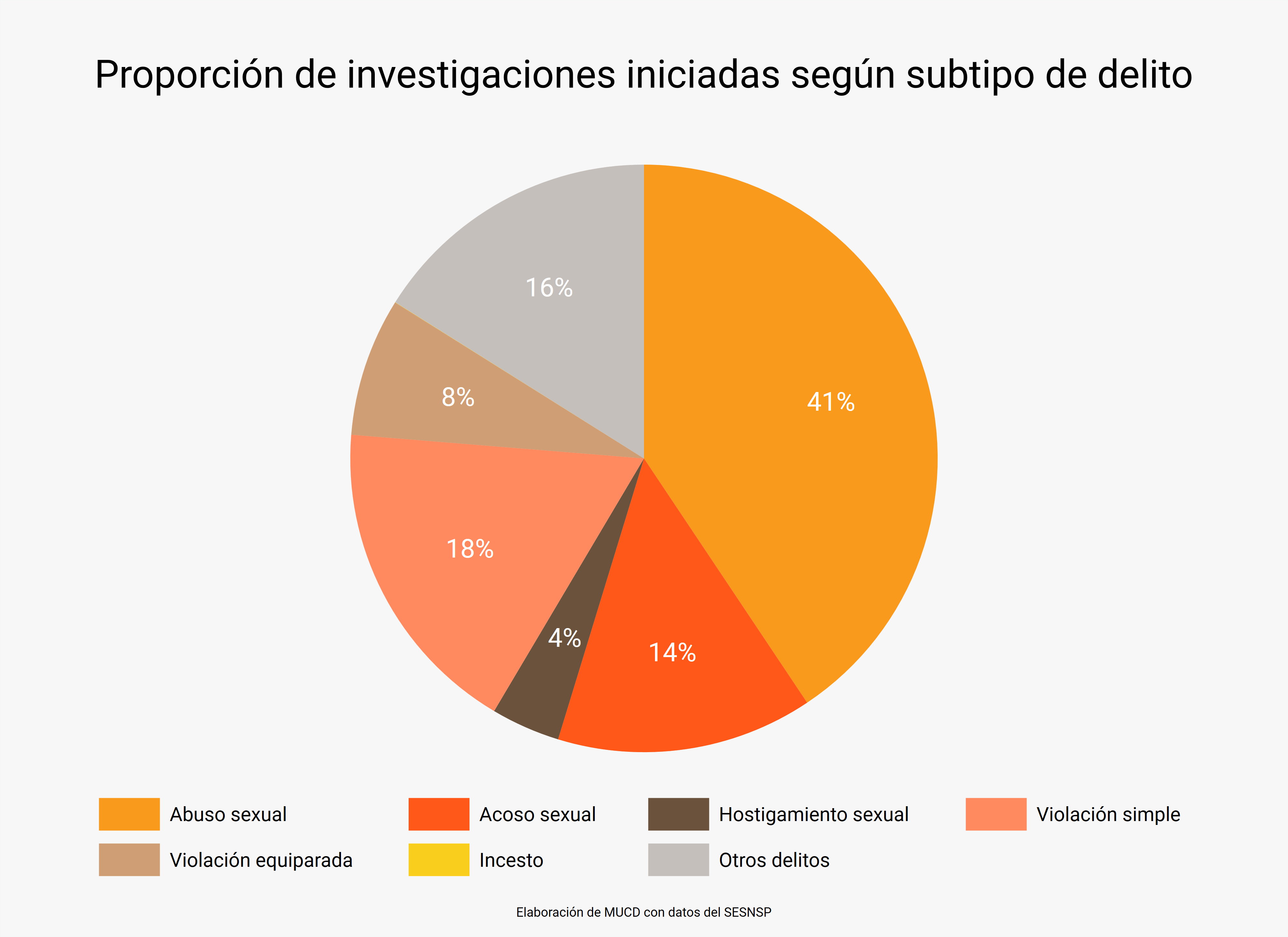 *Para estas categorías de delitos, el instrumento de registro del SESNSP solamente reporta el número de carpetas de investigación iniciadas. No provee información desglosada por víctimas, como la cantidad de víctimas contenidas en una misma carpeta de investigación, su sexo o rango de edad. Es de notar que los delitos sexuales suelen ocurrir con mayor frecuencia dentro de los hogares y afectar desproporcionadamente a las mujeres (cf. CEAV, 2016, Diagnóstico cuantitativo sobre la atención de la violencia sexual en México; Marcela Guerra, 2021, “Violencia familiar, antes y durante el COVID-19”, Nexos).