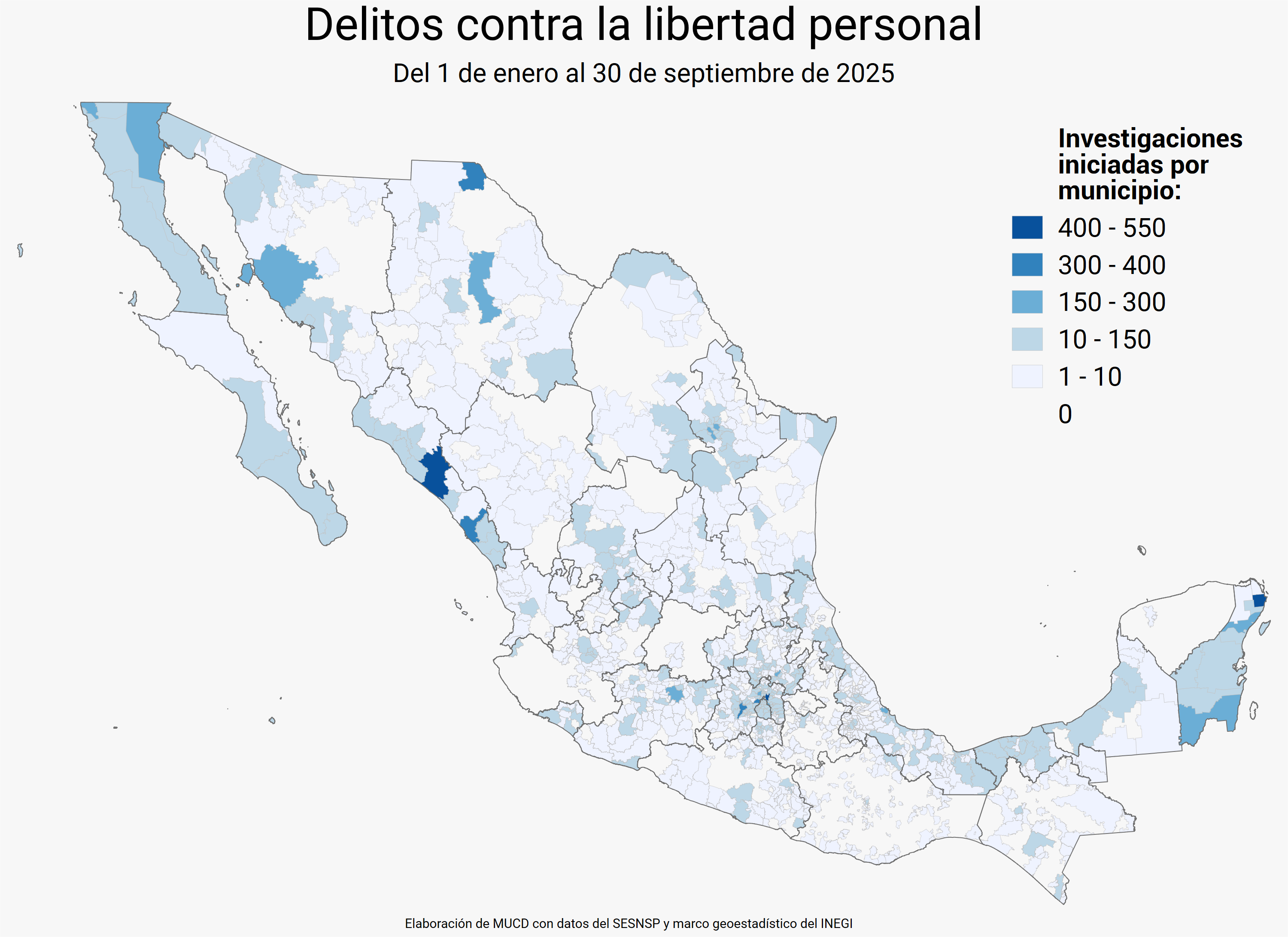 De enero a septiembre de 2025 se registraron 21,778 víctimas por delitos contra la libertad personal, disminuyendo 12% al comparar con los mismos meses de 2024. En lo que va de 2025, el mes con más víctimas fue septiembre con 2,612 y el de menores registros fue febrero con 2,227. La entidad federativa que registró el mayor número de víctimas en el periodo fue Estado de México (con 4,023), mientras que Quintana Roo tuvo la tasa más alta (59 víctimas por cada 100,000 habs., contra 16 a nivel nacional). En contraste, Yucatán fue el estado con la tasa más baja por cada 100 mil habitantes (con 0.08) y sólo ha registrado dos víctimas en lo que va de 2025. A nivel local, los municipios con la mayor concentración de carpetas por estos delitos fueron: Culiacán (Sinaloa), Benito Juárez (Quintana Roo), Ecatepec de Morelos, Toluca y Naucalpan de Juárez (los últimos tres del Estado de México), con 527, 457, 418, 353 y 333 carpetas respectivamente, los que concentran el 11% del total de investigaciones en el país de enero a septiembre de 2025. En el mismo período, los municipios con las tasas más altas de investigaciones iniciadas de delitos contra la libertad personal por cada 100 mil habitantes fueron: Tizayuca, Hidalgo con 99, Solidaridad, Quintana Roo 81 y Pachuca de Soto, Hidalgo con 77. La entidad que ha presentado uno de los aumentos más alarmantes en víctimas de delitos contra la libertad personal es Michoacán, que pasó de 340 víctimas en los primeros nueve meses de 2024 a 859 para el mismo periodo de 2025 (+153%). En contraste, la entidad con la mayor disminución fue Baja California, que pasó de 2,383 víctimas en los primeros nueve meses de 2024 a 869 para el mismo periodo de 2025 (-64%).