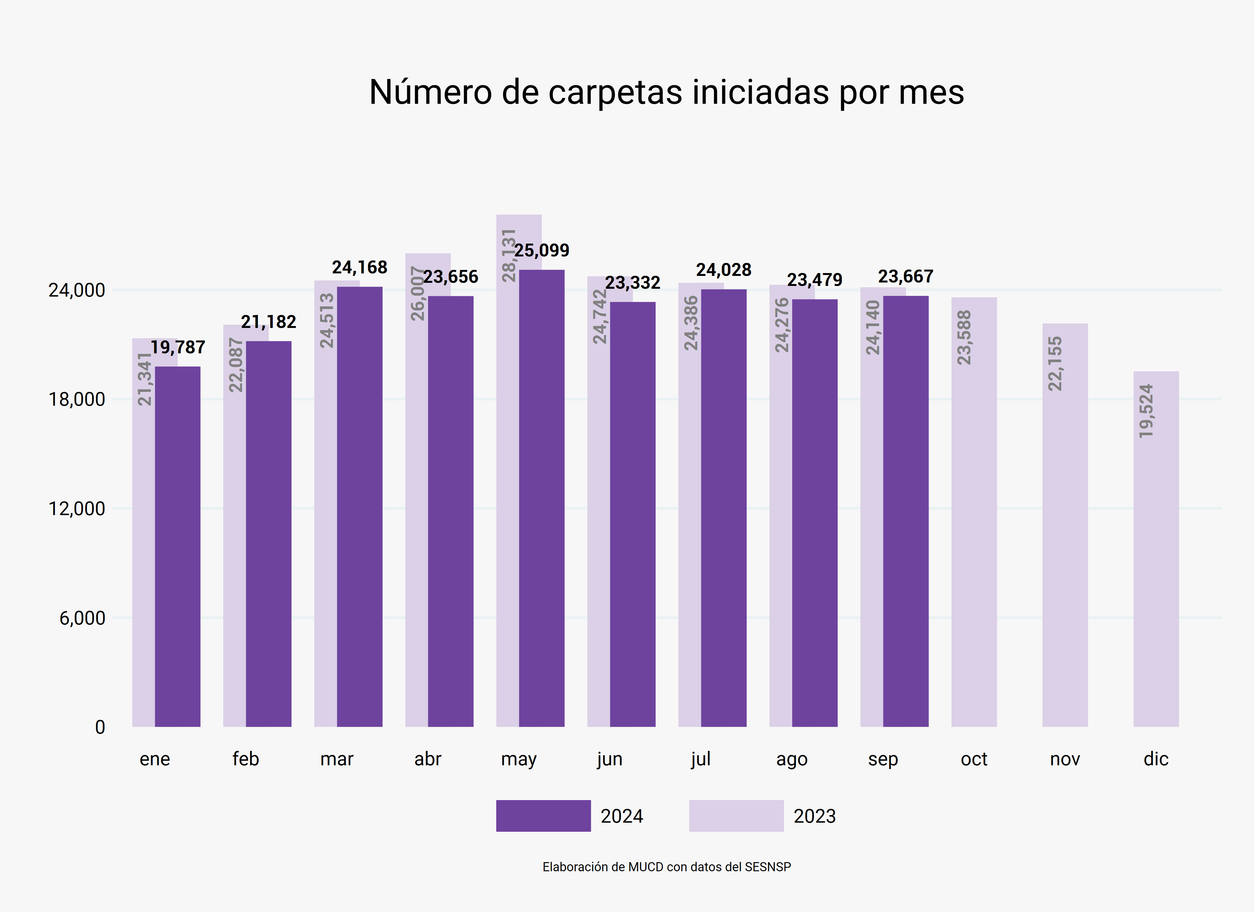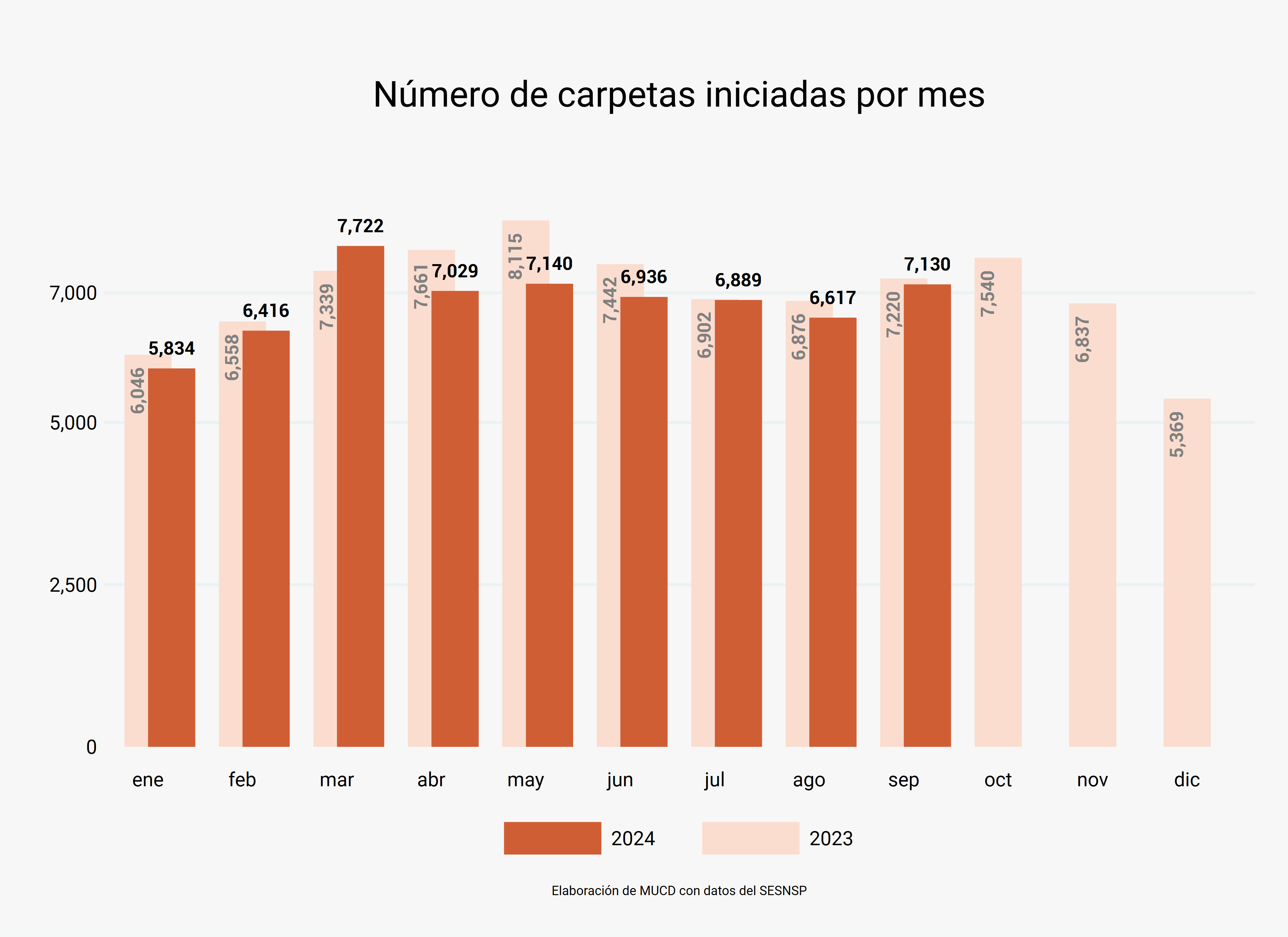 De enero a septiembre de 2025 se iniciaron 61,713 carpetas de investigación a nivel nacional, lo que representó 4% menos al comparar con los mismos meses de 2024. En lo que va de 2025 el mes con más investigaciones iniciadas fue marzo con 7,722 y el de menores registros fue enero con 5,834. Las tres entidades con más carpetas en los primeros nueve meses de 2025 fueron Estado de México, Ciudad de México y Jalisco, las que concentran 34% del total nacional (con 8,264, 6,891 y 5,784 registros respectivamente). Al ponderar por el tamaño de población, Quintana Roo reportaron las tasas más altas por estos delitos (cada una con 109 carpetas iniciadas por cada 100,000 habs., cuando la tasa nacional es de 46). La entidad con menos carpetas iniciadas y con la tasa por cada 100 mil habitantes más baja del país fue Tlaxcala (con 27 y 1.86 respectivamente). A nivel local, destacan los municipios de: Tijuana, Baja California con 1,463 carpetas, Juárez, Chihuahua 1,458, Puebla, Puebla 1,439, Mexicali, Baja California 1,189 y Zapopan, Jalisco con 1,101. Estos municipios concentraron el 11% del total de carpetas iniciadas a nivel nacional. Al ponderar por tamaño de población, los municipios de Cuauhtémoc (CDMX), Solidaridad (Quintana Roo) y Puerto Vallarta (Jalisco) tienen las tasas más preocupantes (con 188, 162 y 137 carpetas iniciadas por cada 100 mil habitantes respectivamente, contra 46 a nivel nacional). Al comparar los primeros nueve meses de 2025 contra el mismo periodo de 2024, uno de los incrementos más preocupantes fue en Yucatán (23%), al pasar de 127 a 156 víctimas. En contraste, la entidad con la mayor disminución fue Campeche (-22%), al pasar de 449 a 348 en los primeros nueve meses de 2025.