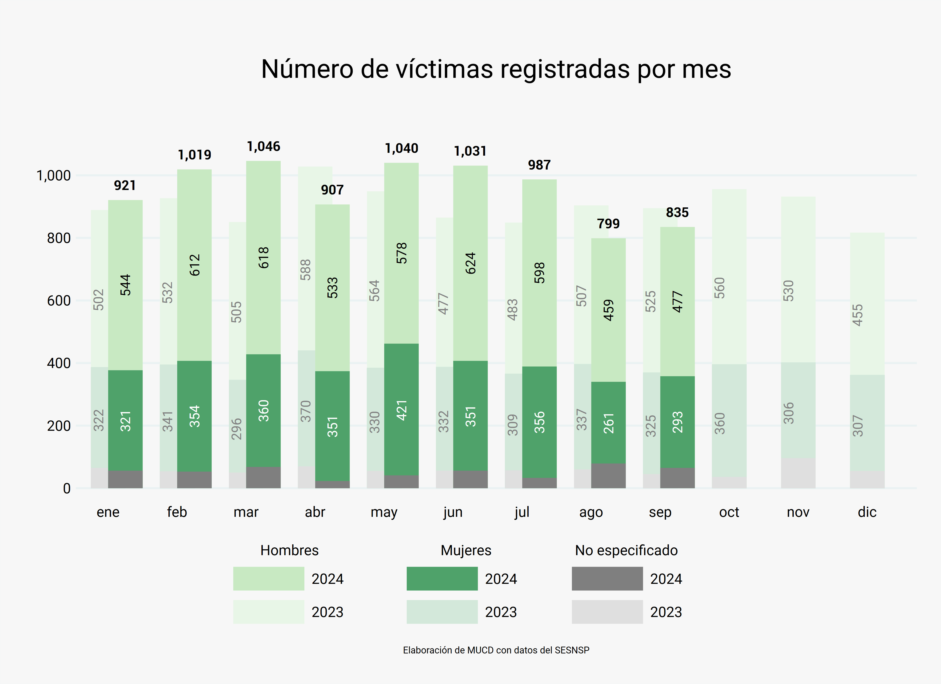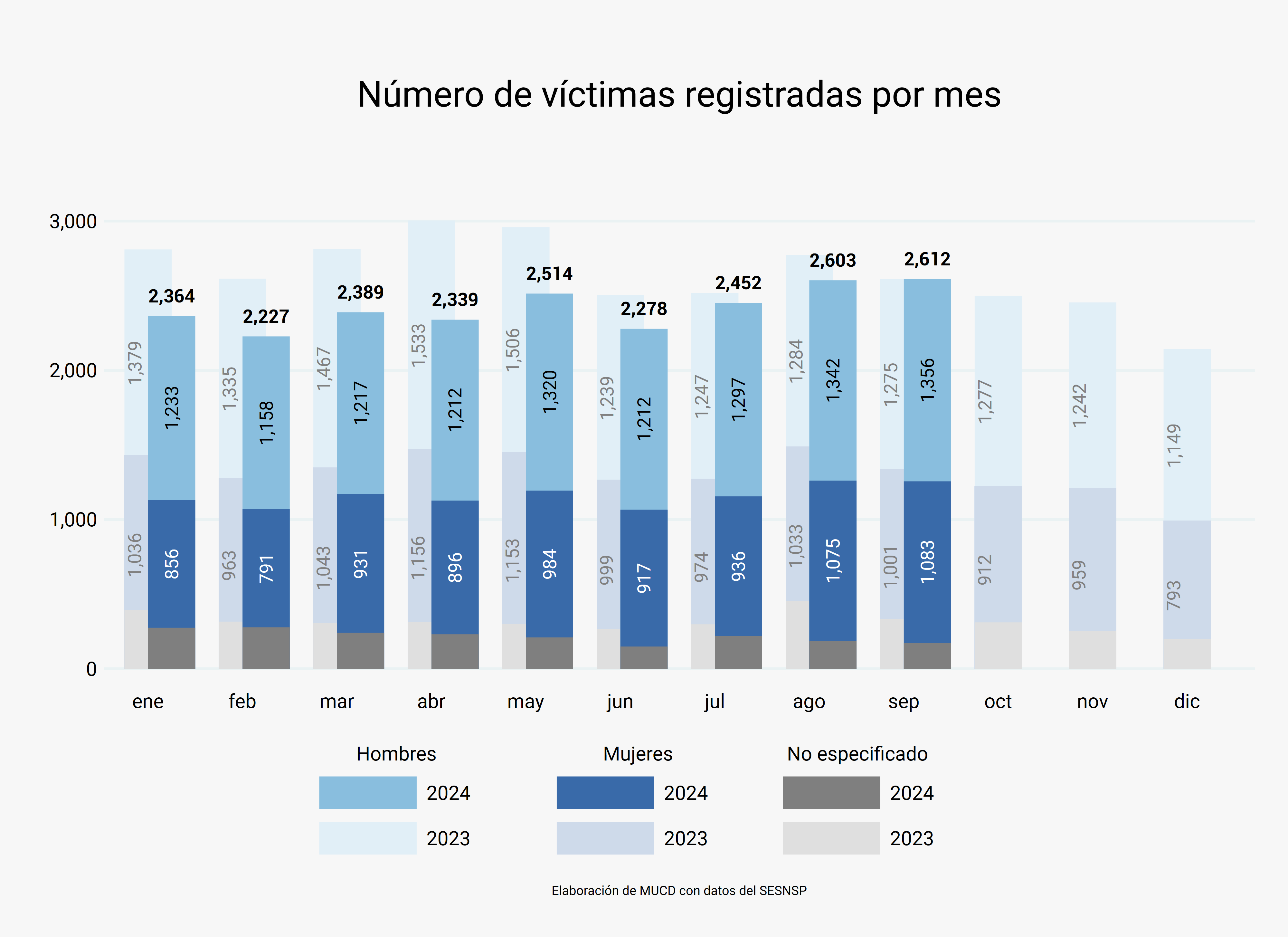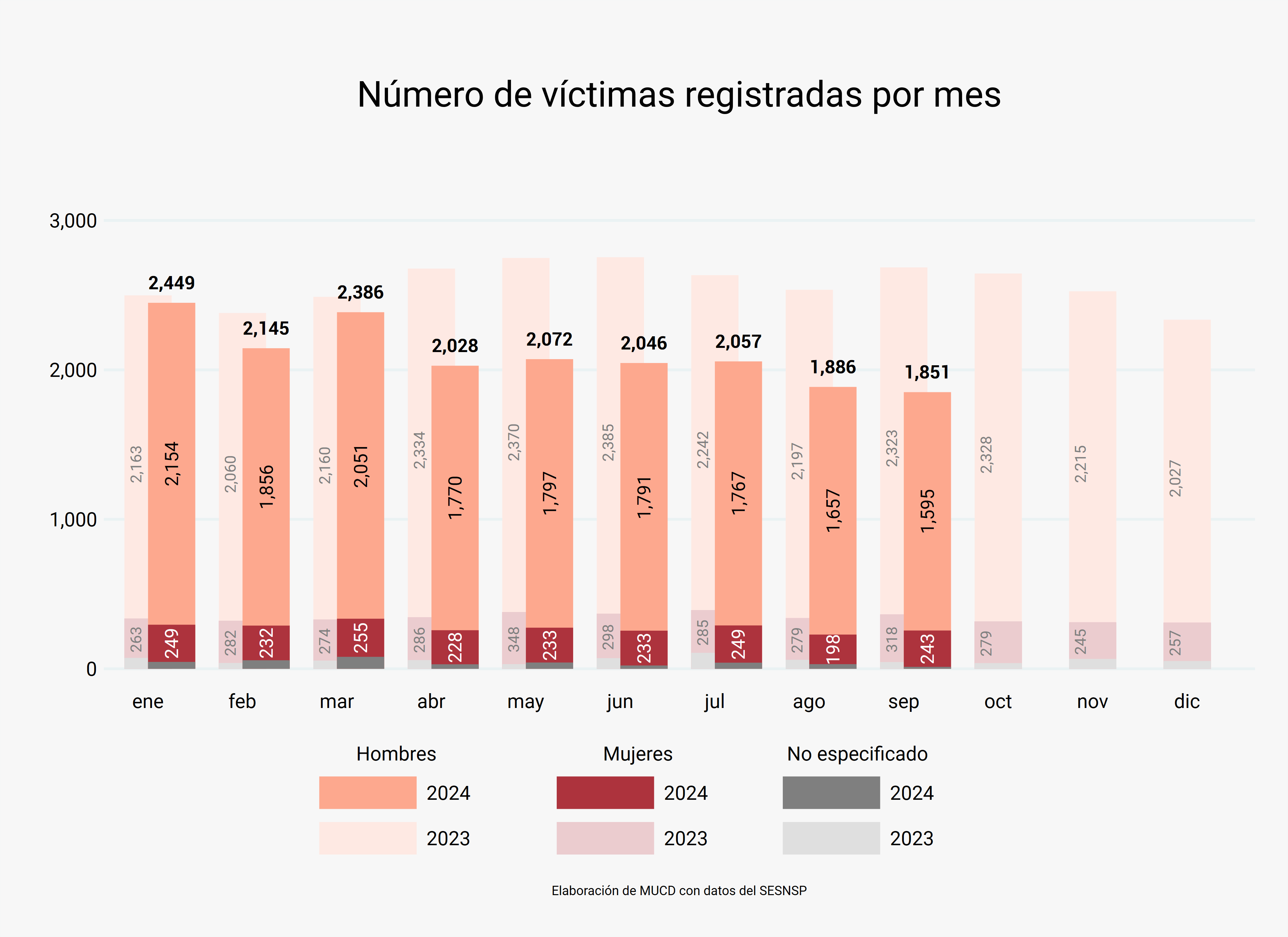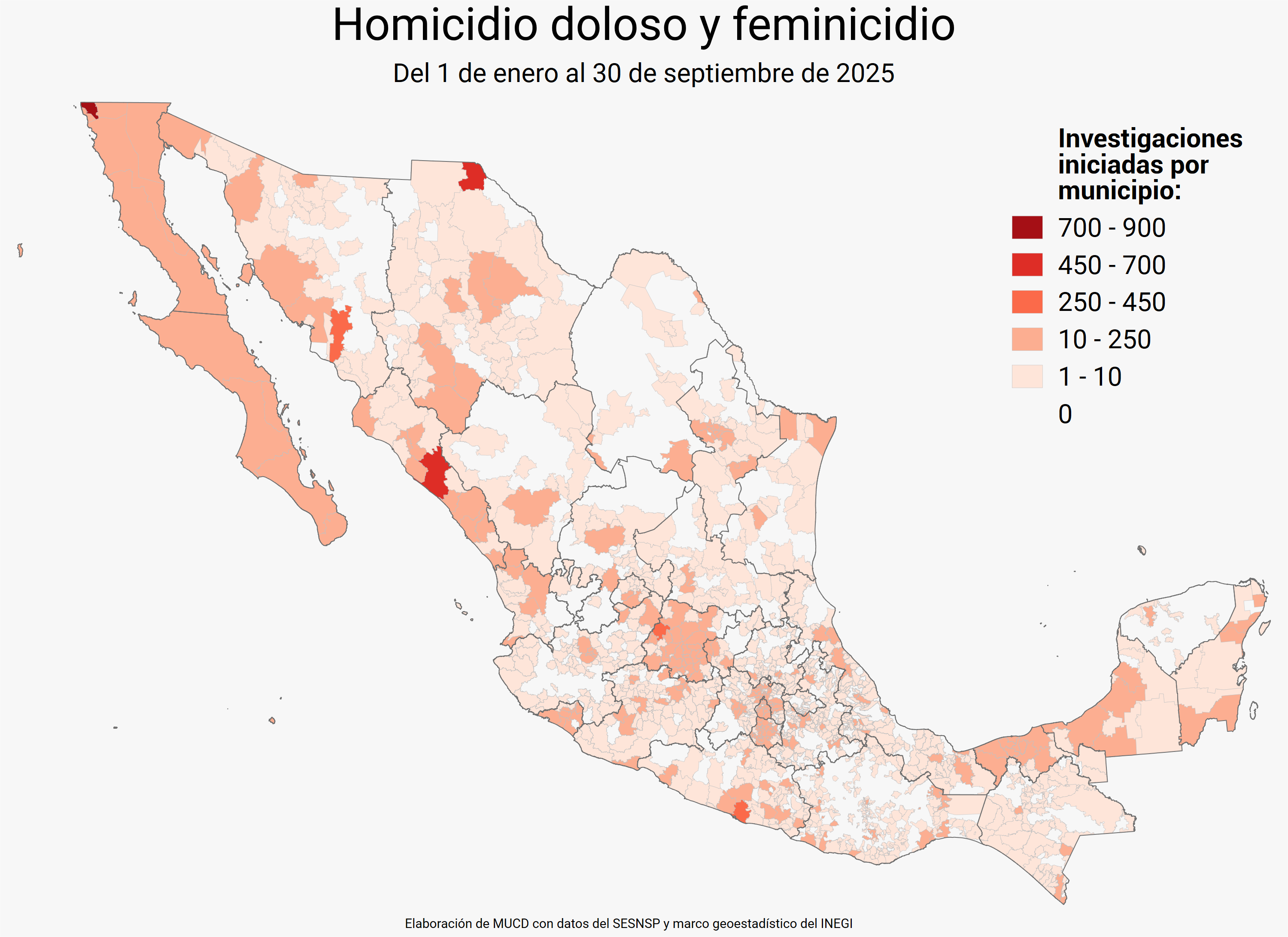 De enero a septiembre de 2025 se registraron 18,920 víctimas a nivel nacional, lo que significó una disminución de 19% respecto a los mismos meses de 2024. El promedio diario de homicidios dolosos y feminicidios reportados en este año culminó en 69. En agosto de 2025, por primera vez desde junio de 2016, el número de víctimas mensuales cayó por debajo de las 2 mil, con un total de 1,886. En lo que va de 2025, el mes con más víctimas fue enero con 2,449 y el mes con la menor cantidad de víctimas fue septiembre con 1,851. El estado con más víctimas para los primeros nueve meses de 2025 fue Guanajuato (2,094), mientras que Colima lo fue con la tasa de víctimas más alta (54 por cada 100,000 habs., contra 14 a nivel nacional). En contraparte, la entidad con menos víctimas fue Yucatán con 29 víctimas, estado que también registró la tasa más baja con 1.22. Si observamos los municipios con 100 mil habitantes o más, destacaron los siguientes tres por tener el mayor número de carpetas y concentrar el 13% de las investigaciones iniciadas en todo el país: 855 Tijuana (Baja California), 682 Culiacán (Sinaloa) y 645 Juárez (Chihuahua). Al mismo tiempo, Manzanillo (Colima), San Luis Río Colorado (Sonora) y Apatzingán (Michoacán) fueron los municipios con las tasas más altas, con 85, 81 y 74 investigaciones iniciadas por cada 100 mil habitantes respectivamente (contra una tasa de 12 a nivel nacional). Por su parte, la entidad que tiene uno de los aumentos más alarmantes en víctimas de homicidio doloso y feminicidio es Sinaloa (170%), que pasó de 496 víctimas en los primeros nueve meses de 2024 a 1,341 para el mismo periodo de 2025. En contraste, la entidad con la mayor disminución fue Zacatecas (-69%), al pasar de 396 víctimas en los primeros nueve meses de 2024 a 124 para el mismo periodo de 2025.