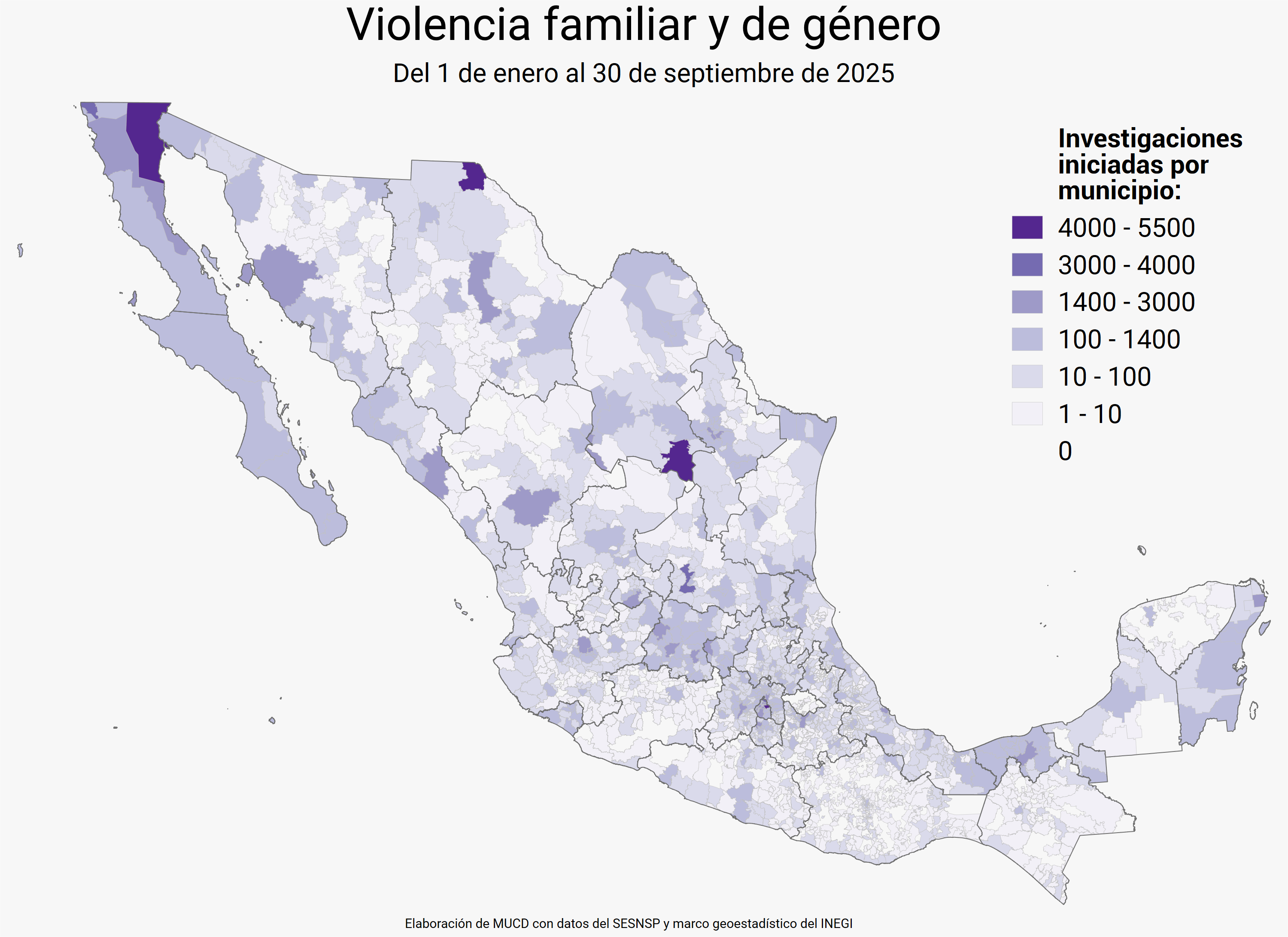 ◉ Violencia familiar y de género208,398 carpetas de investigación se iniciaron por este delito, lo que significó una disminución de 5% si comparamos con los mismos meses de 2024. En particular, los municipios con mayor número de registros de carpetas fueron Juárez (Chihuahua), Mexicali (Baja California) y Iztapalapa (Ciudad de México), los cuales concentraron el 7% de investigaciones iniciadas en el país (con 5,415, 4,712 y 4,141 respectivamente).