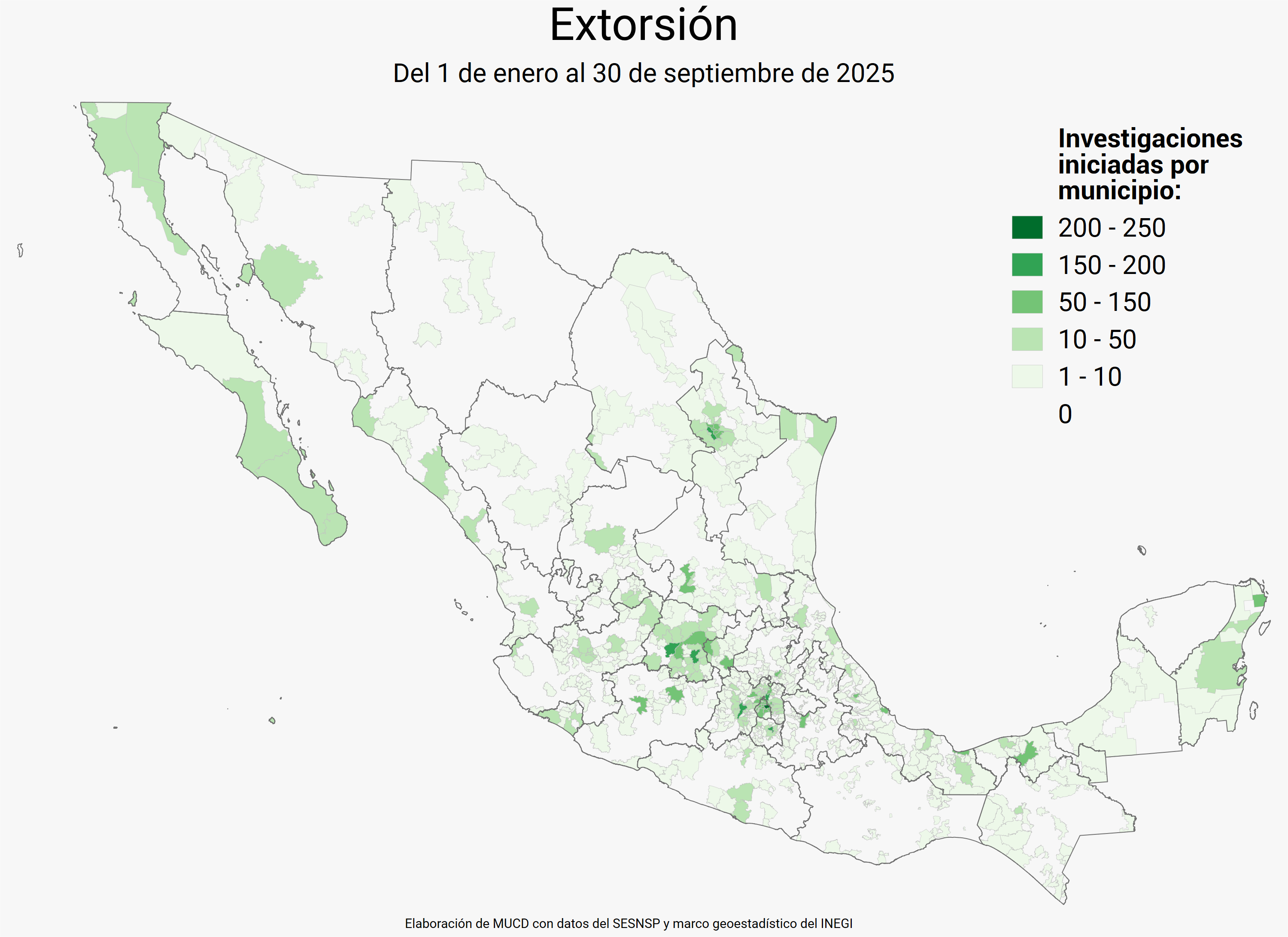 De enero a septiembre de 2025 se registraron 8,585 víctimas a nivel nacional, lo que significó un aumento de 5% respecto a los mismos meses de 2024. En lo que va de 2025, el mes con más víctimas fue marzo (con 1,046) y el de menores registros fue agosto (con 799). El Estado de México concentró 22% del total de casos reportados a nivel nacional (con 1,906 víctimas) y los tres municipios con la mayor cantidad de investigaciones iniciadas en los primeros nueve meses de 2025 pertenecen a esta entidad (Iztapalapa con 233, Toluca 197 y Ecatepec de Morelos 190). En contraparte, el estado de Yucatán tuvo sólo dos víctimas por este delito, además de la tasa más baja con 0.08 víctimas por cada 100,000 habs. Al ponderar por tamaño de población, los tres municipios con la tasa más alta por cada 100 mil habitantes fueron: Cuautla, Morelos con 86, Salamanca con 42 y Celaya con 31 (los últimos dos de Guanajuato). Al comparar los primeros nueve meses de 2025 contra el mismo periodo de 2024, Chiapas registra el incremento más preocupante (883%), al pasar de 12 a 118 víctimas. En contraste, la entidad con la mayor disminución fue Campeche (-60%), al pasar de 48 víctimas en los primeros meses de 2024 a 19 en los mismo mes de 2025.