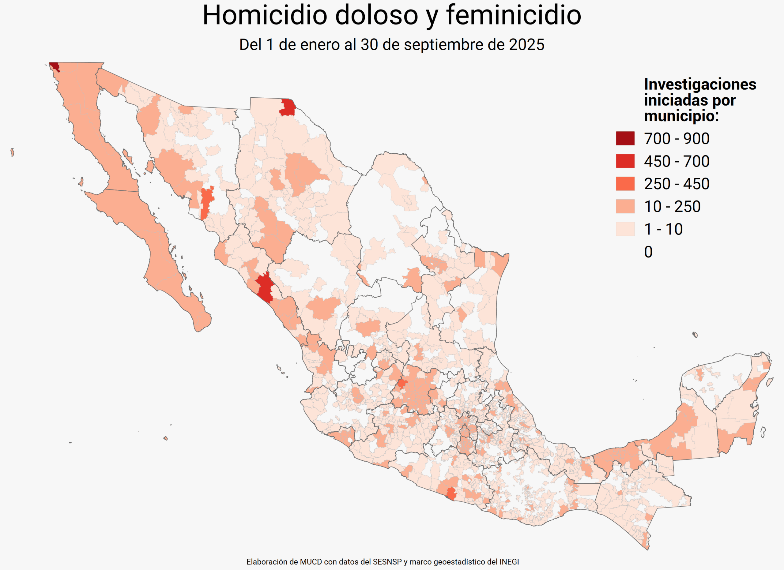 De enero a septiembre de 2025 se registraron 18,920 víctimas a nivel nacional, lo que significó una disminución de 19% respecto a los mismos meses de 2024. El promedio diario de homicidios dolosos y feminicidios reportados en este año culminó en 69. En agosto de 2025, por primera vez desde junio de 2016, el número de víctimas mensuales cayó por debajo de las 2 mil, con un total de 1,886. En lo que va de 2025, el mes con más víctimas fue enero con 2,449 y el mes con la menor cantidad de víctimas fue septiembre con 1,851. El estado con más víctimas para los primeros nueve meses de 2025 fue Guanajuato (2,094), mientras que Colima lo fue con la tasa de víctimas más alta (54 por cada 100,000 habs., contra 14 a nivel nacional). En contraparte, la entidad con menos víctimas fue Yucatán con 29 víctimas, estado que también registró la tasa más baja con 1.22. Si observamos los municipios con 100 mil habitantes o más, destacaron los siguientes tres por tener el mayor número de carpetas y concentrar el 13% de las investigaciones iniciadas en todo el país: 855 Tijuana (Baja California), 682 Culiacán (Sinaloa) y 645 Juárez (Chihuahua). Al mismo tiempo, Manzanillo (Colima), San Luis Río Colorado (Sonora) y Apatzingán (Michoacán) fueron los municipios con las tasas más altas, con 85, 81 y 74 investigaciones iniciadas por cada 100 mil habitantes respectivamente (contra una tasa de 12 a nivel nacional). Por su parte, la entidad que tiene uno de los aumentos más alarmantes en víctimas de homicidio doloso y feminicidio es Sinaloa (170%), que pasó de 496 víctimas en los primeros nueve meses de 2024 a 1,341 para el mismo periodo de 2025. En contraste, la entidad con la mayor disminución fue Zacatecas (-69%), al pasar de 396 víctimas en los primeros nueve meses de 2024 a 124 para el mismo periodo de 2025.
